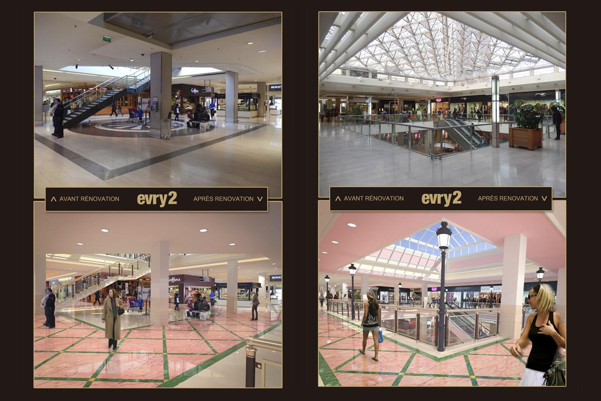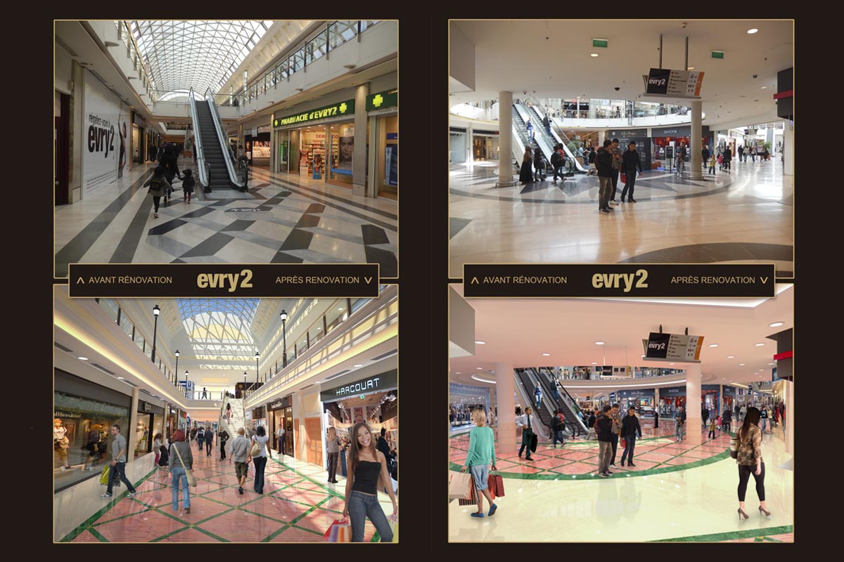 Centro Comercial Evry 2 es un proyecto promovido por la empresa propietaria de importantes centros comerciales en toda Europa como Plaza Norte 2, Gran Plaza 2, Gran Vía 2 entre otros. La idea del proyecto era representar el centro comercial interiormente a través de imágenes realizadas con infografía 3D y un vídeo de presentación realizado con animación 3D. Generando un entorno fiel a los detalles y un modelo 3D completo del edificio.