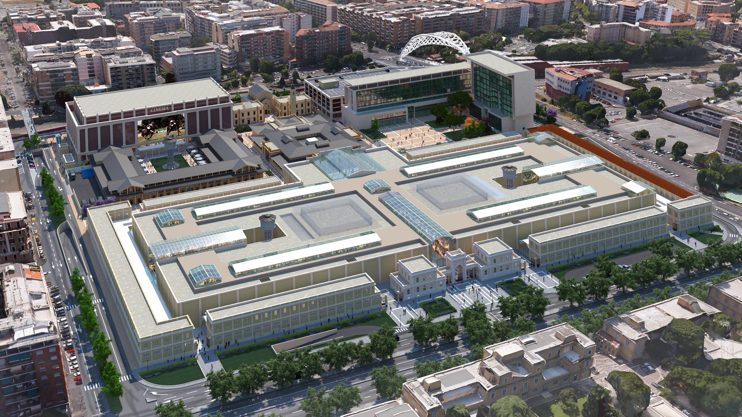 Rehabilitación de Mercato Generali en Vía Oscense, Roma, un plan de renovación de una gran superficie comercial dedicada a oficinas, parking, cines, iglesia, biblioteca y centro comercial en el centro de la capital italiana.